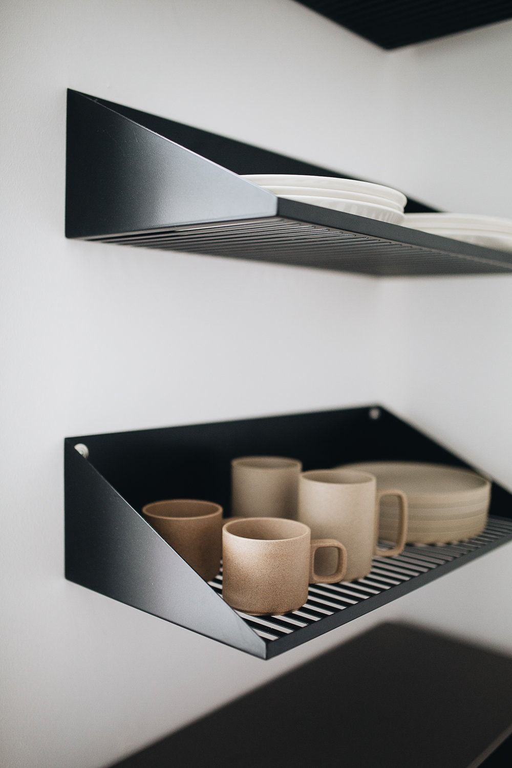 Raft metalic minimalist, ideal pentru depozitarea elegantă a cănilor, condimentelor sau obiectelor de uz zilnic. Construit din metal rezistent și finisat prin vopsire electrostatică, oferă durabilitate, stabilitate și un aspect modern, potrivit pentru bucătării contemporane, industriale sau minimaliste.